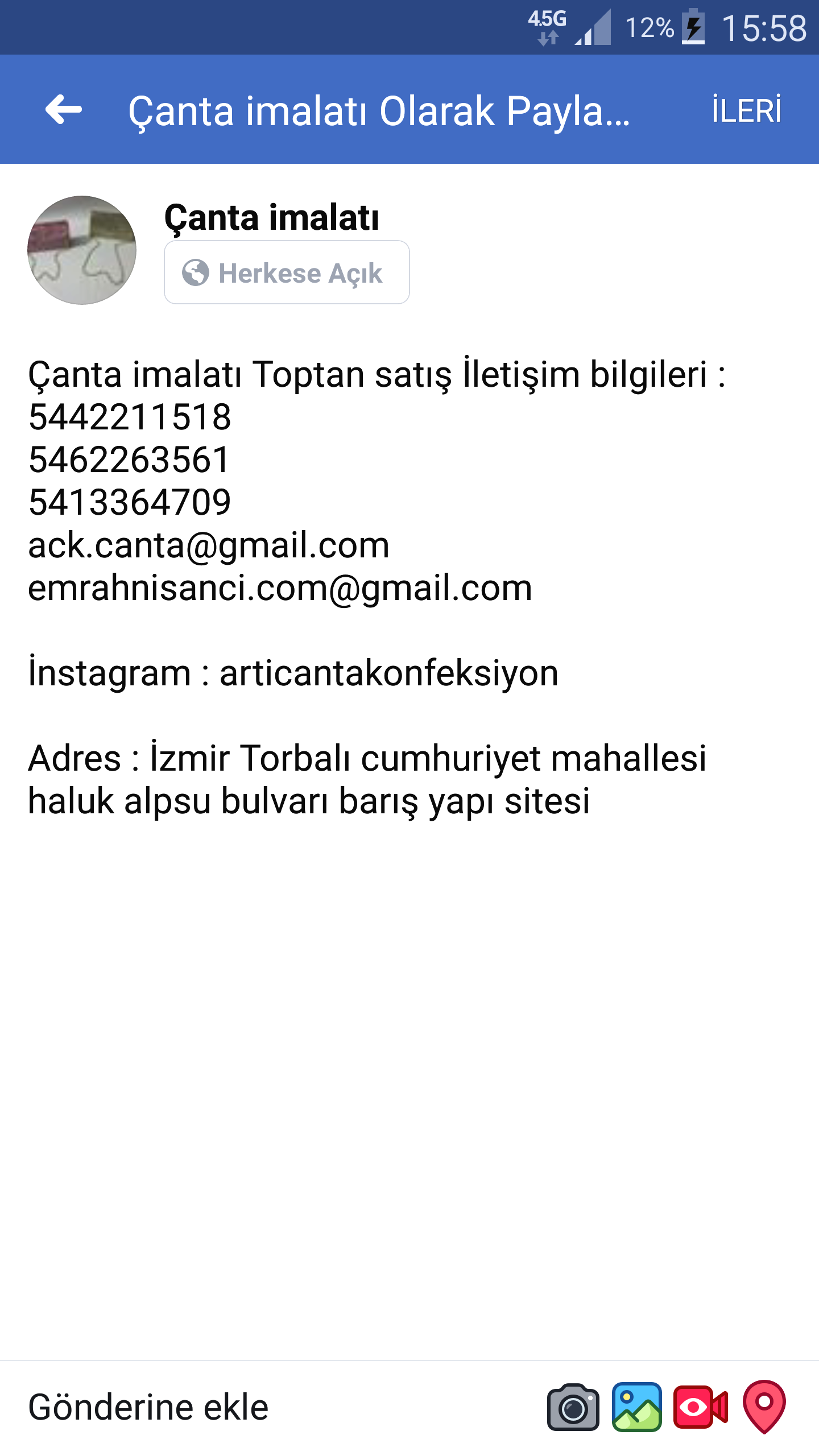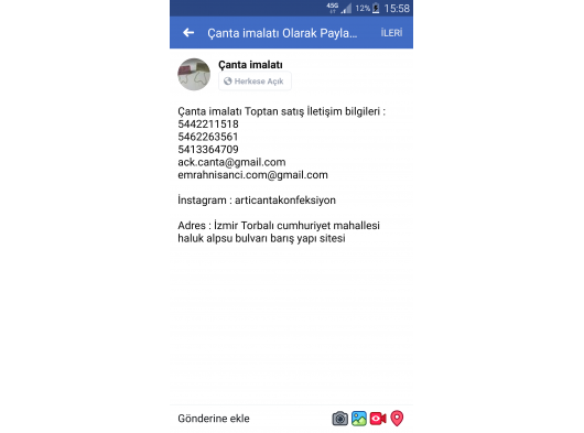 Çanta modelleri ve imalatı Uygun fiyatlıbütçe dostu kaliteli malzeme ve güzel görünümlü şık çanta modelleri Deri çanta, keçe çanta, fermuar çanta, bez çanta, suni deri çanta, yazlık çanta, spor çanta Bilekten asmalı, Yazlık çanta, promosyon çanta, Koldan askılı çanta, Omuzdan asmalı,el çantası, cüzdan vs İletişim bilgileri 5442211518 5413364709 Gmail: ack.canta@gmail.com emrahnisanci.com@gmail.com İnstagram : articantakonfeksiyon Adres : Torbalı izmir haluk alpsu bulvarı cumhuriyet mahallesi barış yapı sitesi Çanta fiyatları 1.80tl 3.25tl 6tl 7.50 tl 10 tl 15 tl 20tl 25tl Artı çanta ve konfeksiyon Çanta imalatı Toptan satış