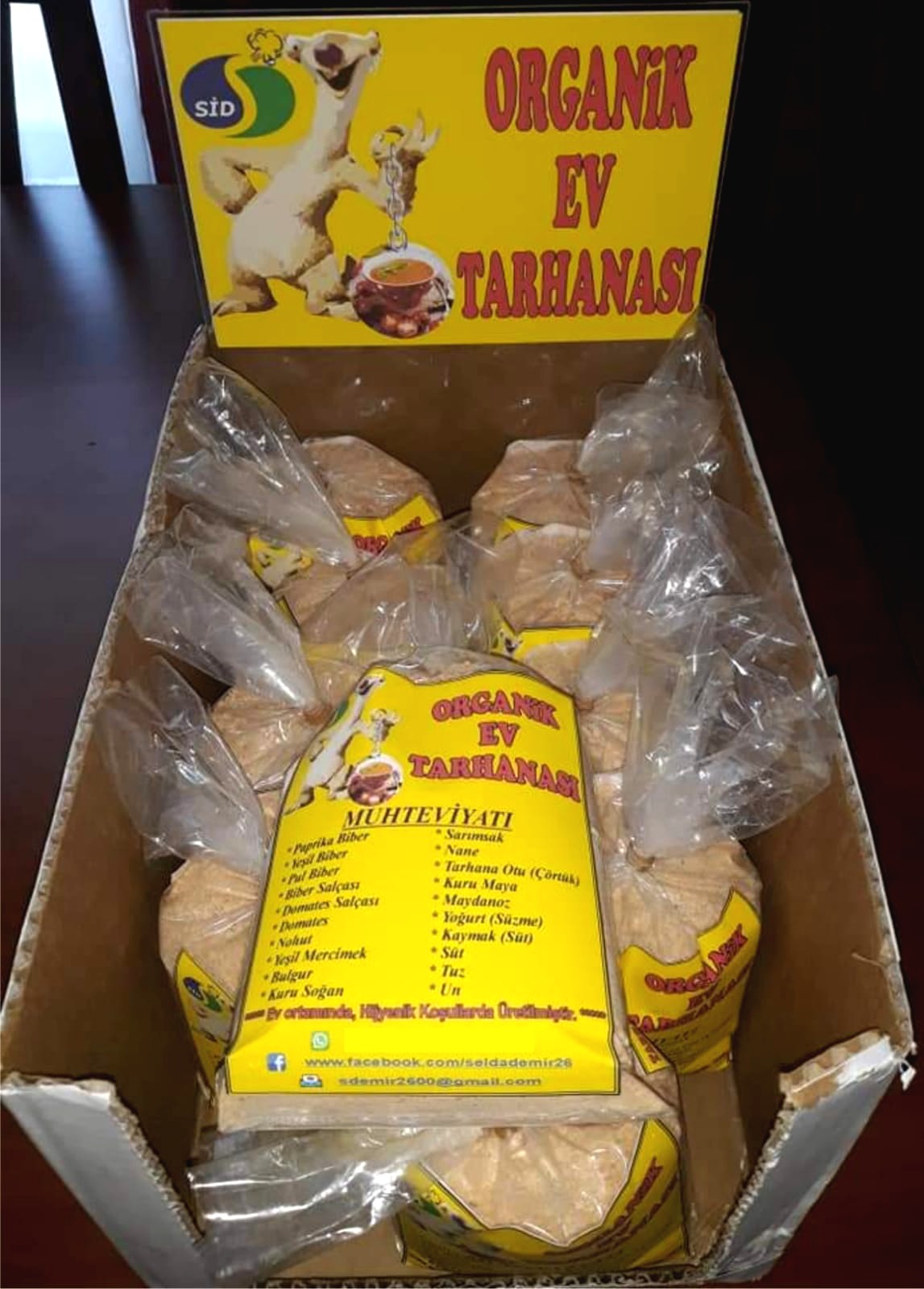 Ev ortamında Hijyenik koşullarda üretilmiştir. Tarhanamizin içindekiler; Paprika biber, Yeşil biber, Biber Salçası, Domates Salçası, Domates, Nohut, Yoğurt (süzme/normal), Süt kaymağı, Kuru soğan, Sarımsak, Nane, Tarhana otu (Çörtuk), Maydanoz, Pul biber, Tuz, Un, Süt, Kuru Maya...nin